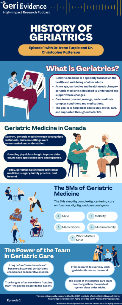 This episode infographic traces the history of geriatrics, explaining what geriatric medicine is, how it developed in Canada, and how team-based, person-centered care continues to shape aging care today.