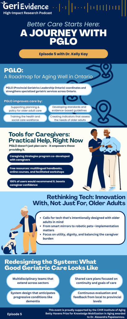This episode infographic highlights how Provincial Geriatrics Leadership Ontario (PGLO) is strengthening geriatric care in Ontario by supporting coordinated services, empowering caregivers, and promoting system-level innovation for aging well.