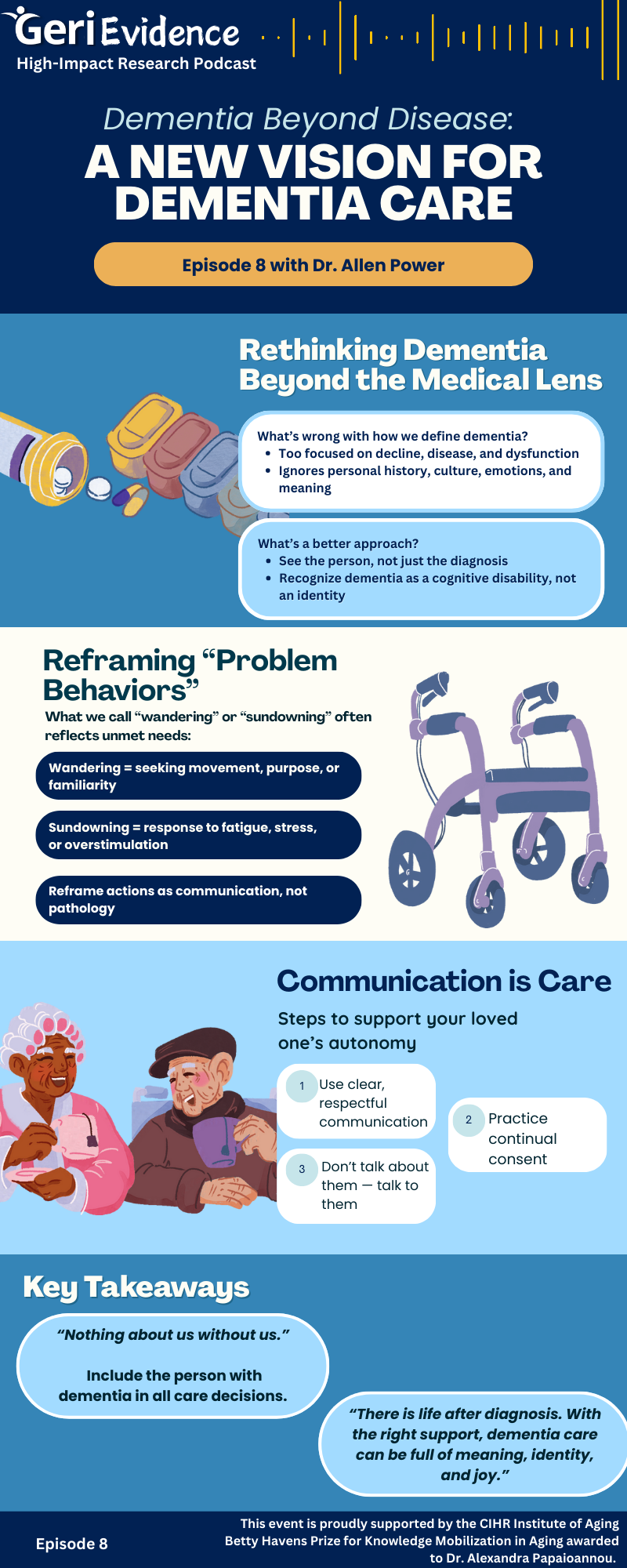This episode infographic captures key insights from the podcast, reframing dementia beyond a medical diagnosis and emphasizing personhood, communication, and meaningful, inclusive care.